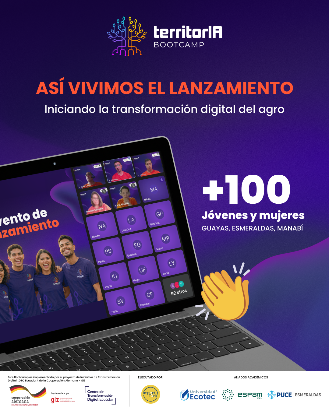 Más de 100 jóvenes y mujeres de distintos territorios del Ecuador se conectaron para dar inicio a TerritorIA Bootcamp, una iniciativa que busca cerrar brechas digitales en el sector agroproductivo y abrir nuevas oportunidades a través de la tecnología. Este lanzamiento marcó el inicio de un proceso formativo donde los participantes aplicarán inteligencia artificial a desafíos reales del agro, fortaleciendo sus capacidades y posicionándose como agentes de cambio en sus comunidades.