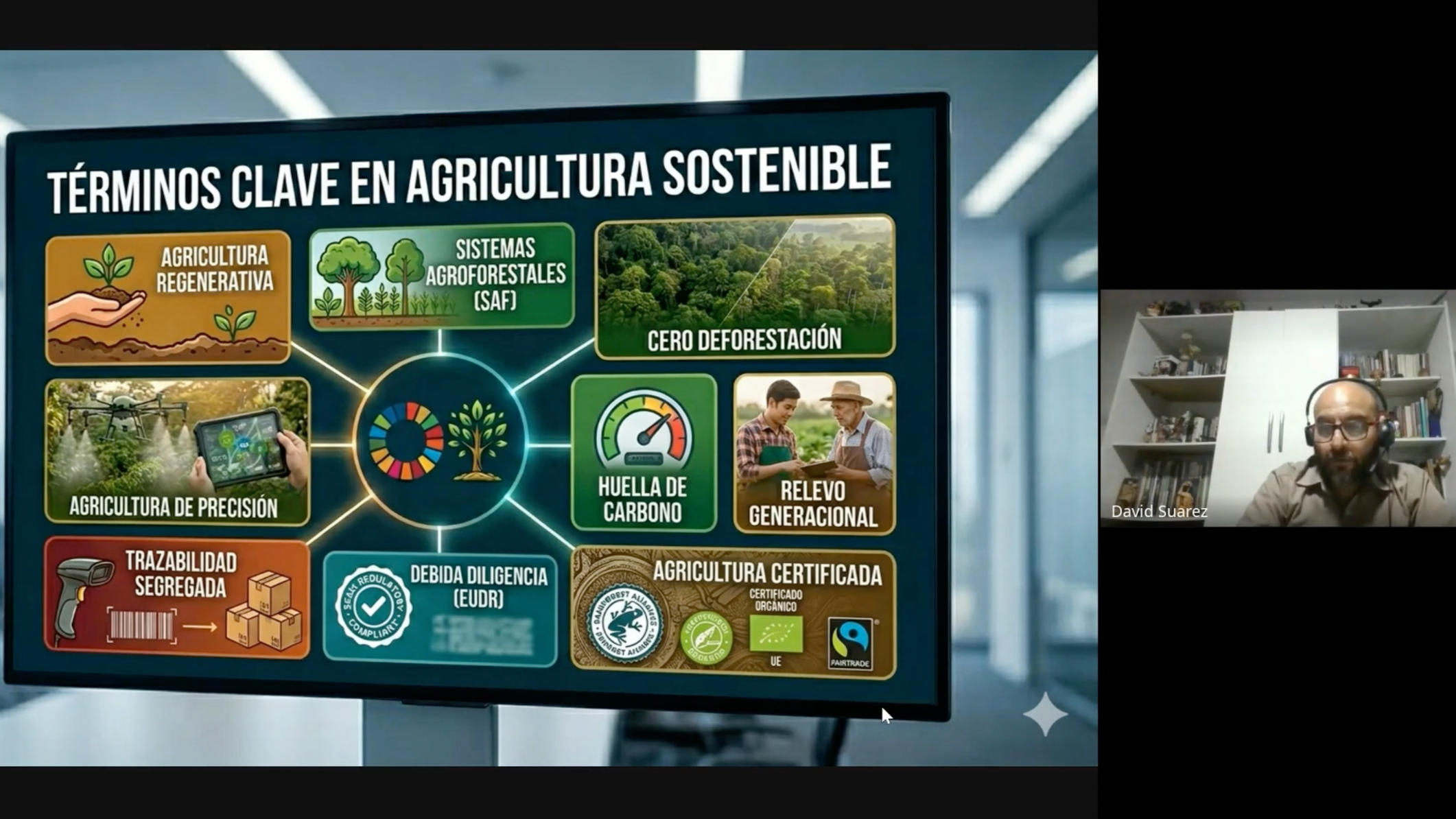 Durante la sesión, se exploraron conceptos como agricultura sostenible, agricultura regenerativa, certificaciones y trazabilidad, entendiendo que estos elementos están profundamente conectados. Los participantes reflexionaron sobre las tensiones del desarrollo actual y la necesidad de transformar la forma en que producimos, especialmente en contextos como Ecuador, donde existen brechas en acceso a tecnología y capacidades.